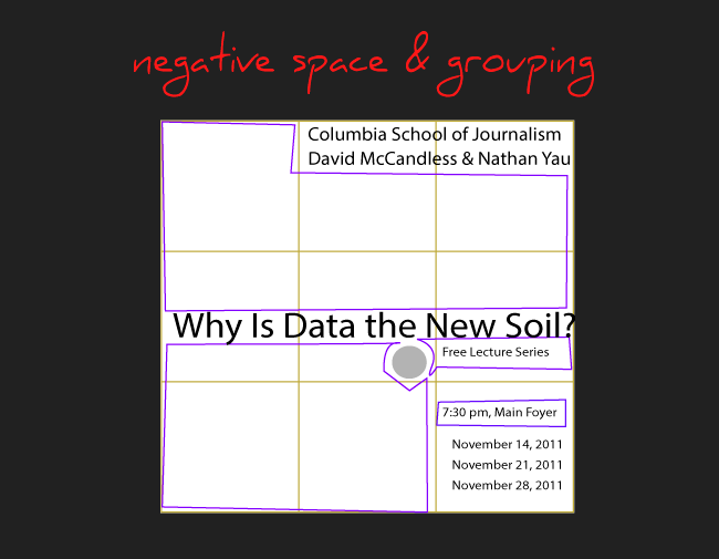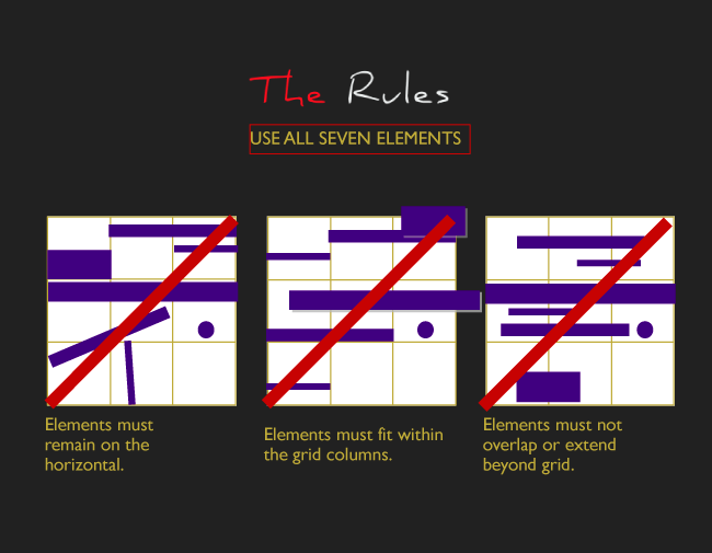The grid exercise described in the first paragraphs of this post is a looser version of the basic exercise (with various levels of restrictions) that Kimberly Elam develops in her book (course) on the grid and graphic design, Grid Systems, from which the quote above is taken. (3) The red rectangles represent blocks of text and the circle is a wild card.